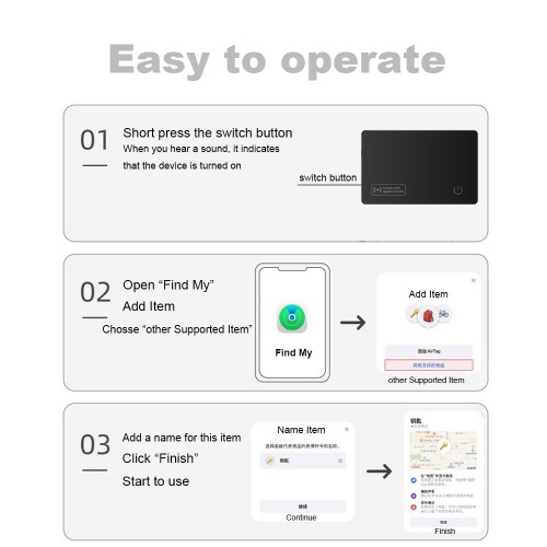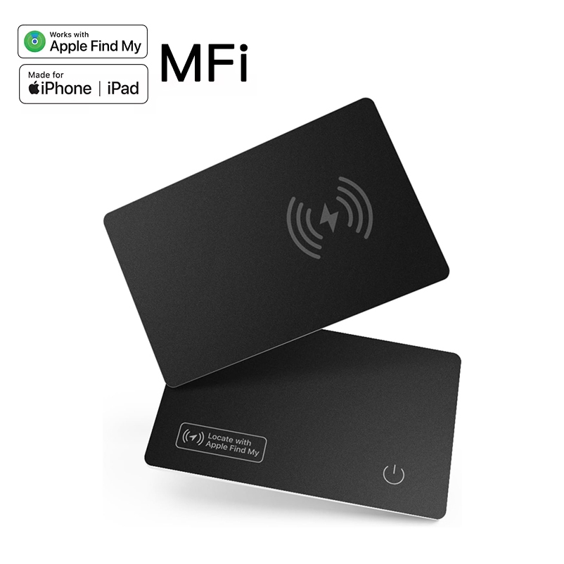 *Card Finder *Work with APPLE FIND MY directly *Support system: Apple iOS 7.0 and above *Material: PVC *Chipset: ASR *Color: black *Bluetooth version:V5.2 *Volume: 90-100dB *Range: 30M *Waterproof: IP67 *Battery Capacity: 110mAh Li battery (Wireless rechargeable) *Product Size:54*85*1.8mm *Package: paper box *Certificate: Work with Apple Find My |